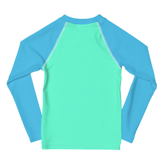 YMT classics kids long sleeve rash guard swim top UPF50 by night neon green blue.