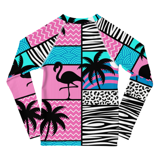 kids long sleeve rash guard swim top UPF50 miami by night blue pink art deco.