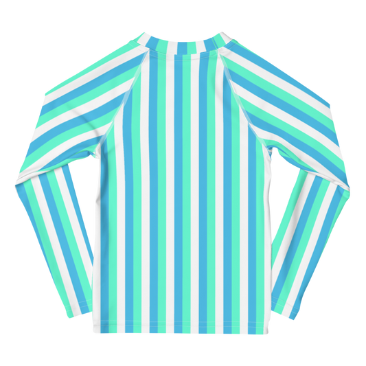 kids long sleeve rash guard swim top UPF50 miami by day neon blue green stripes.