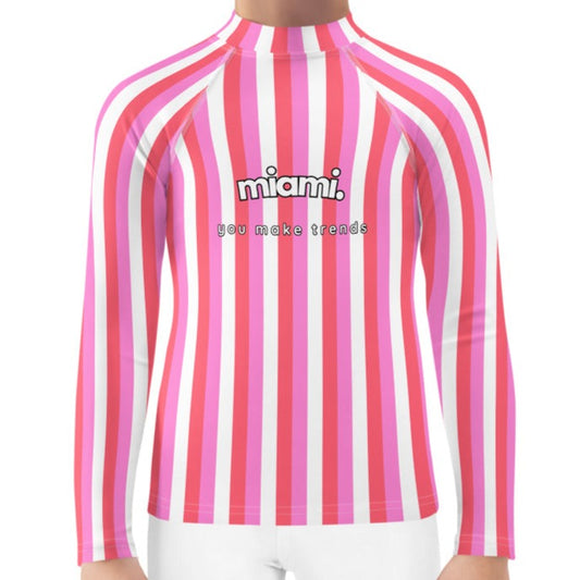 kids long sleeve rash guard swim top UPF50 miami by day neon pink coral stripes.