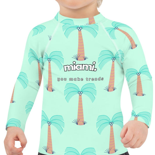 kids long sleeve rash guard swim top UPF50 miami by night blue green mint palm trees.