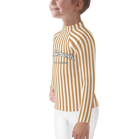 YMT classics kids long sleeve rash guard swim top UPF50 by day yellow orange brown mustard stripes.