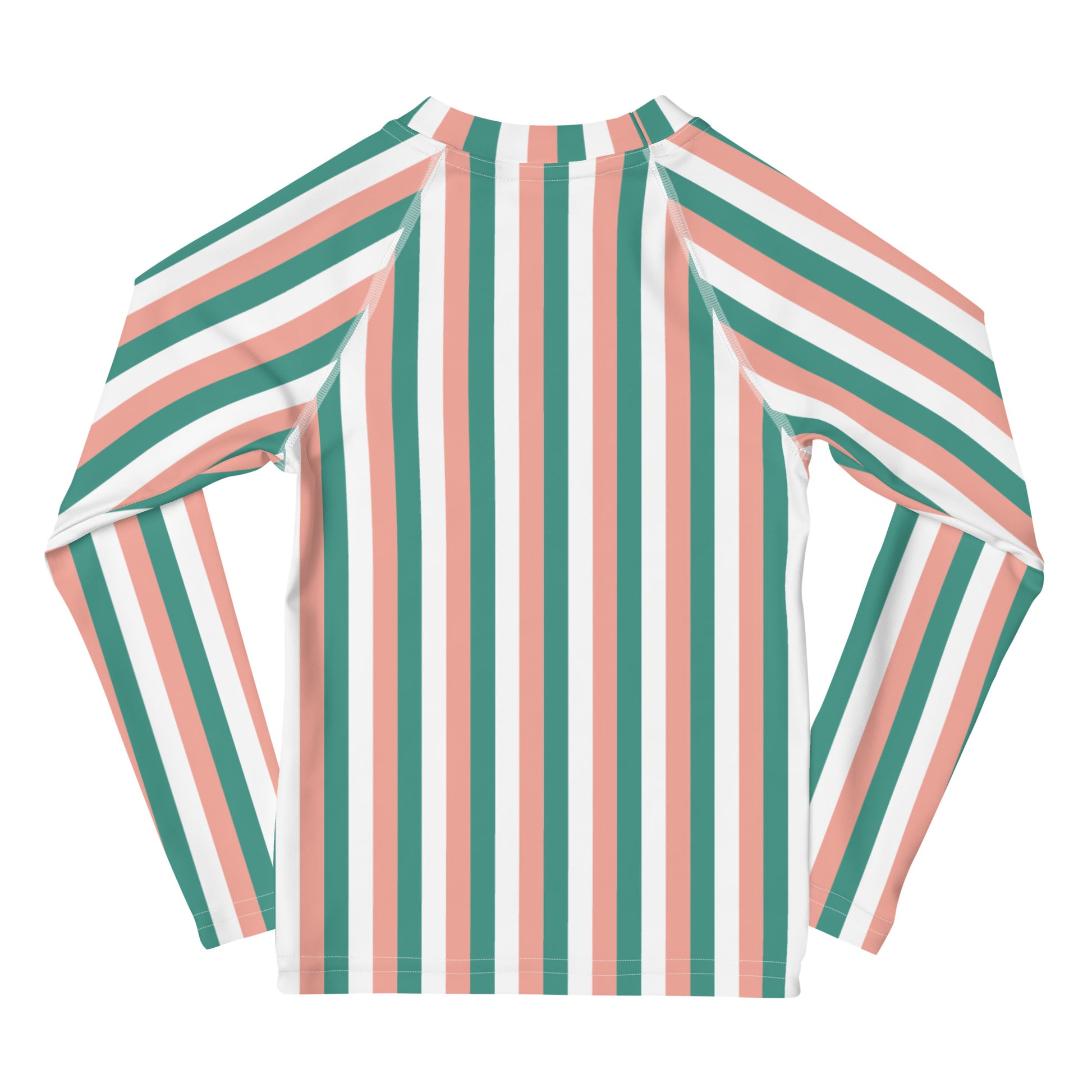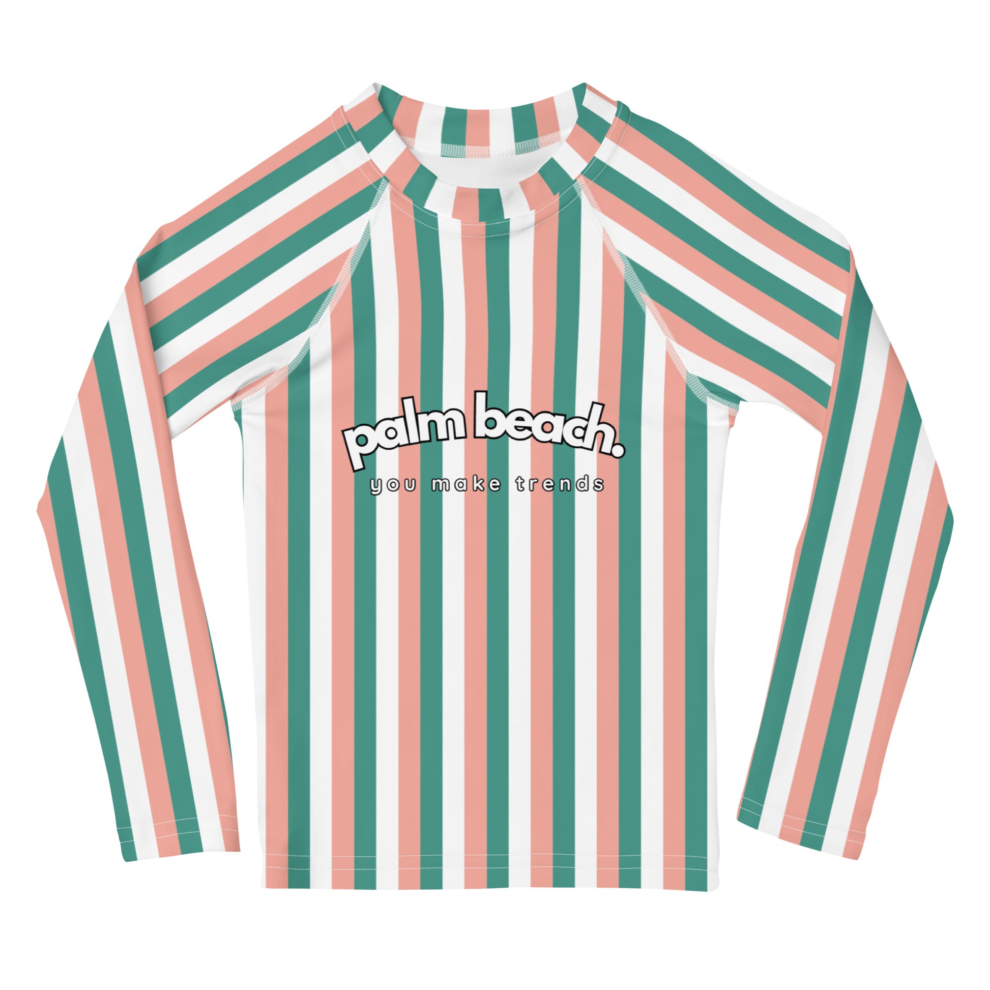 kids long sleeve rash guard swim top UPF50 palm beach by day pink green stripes.