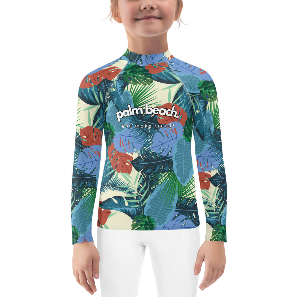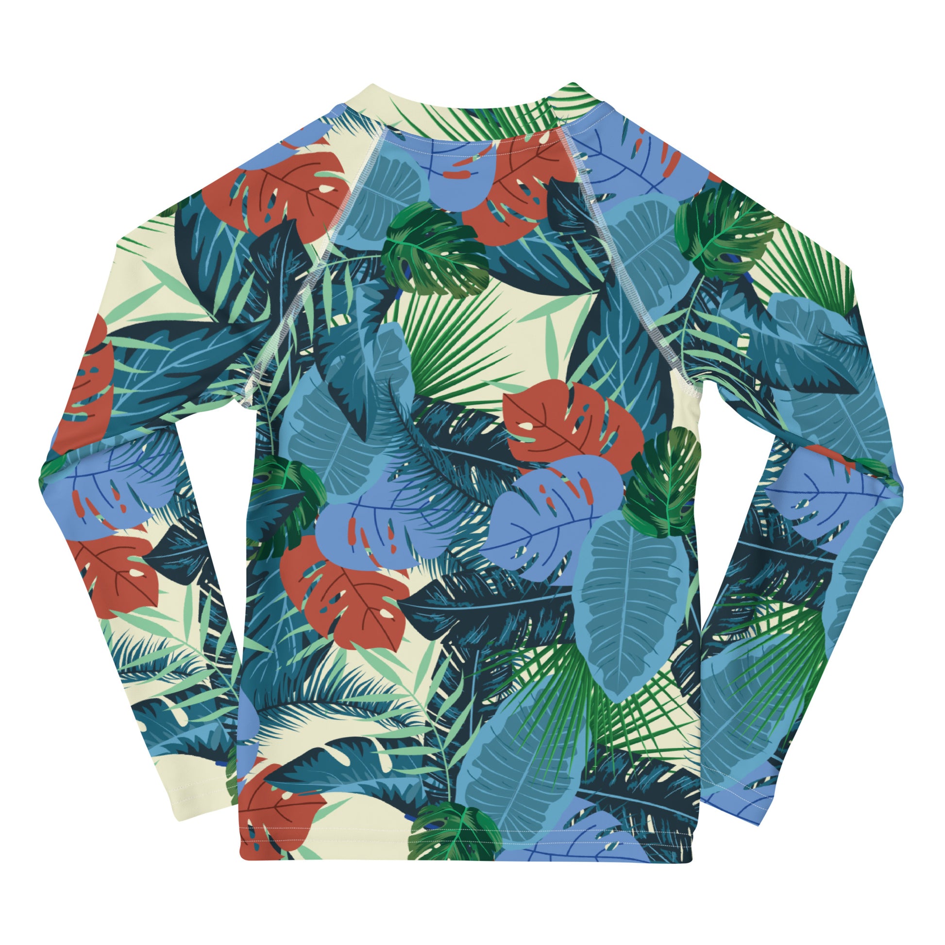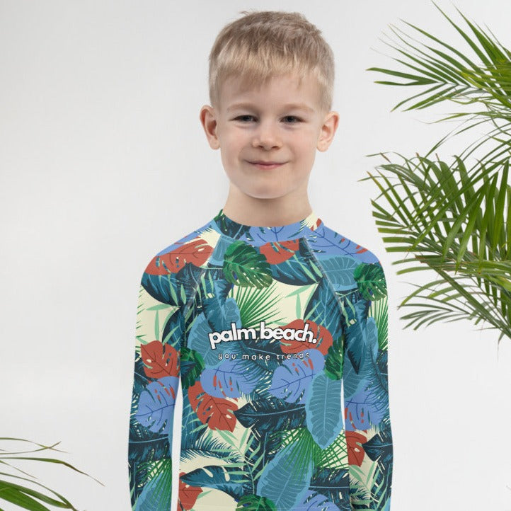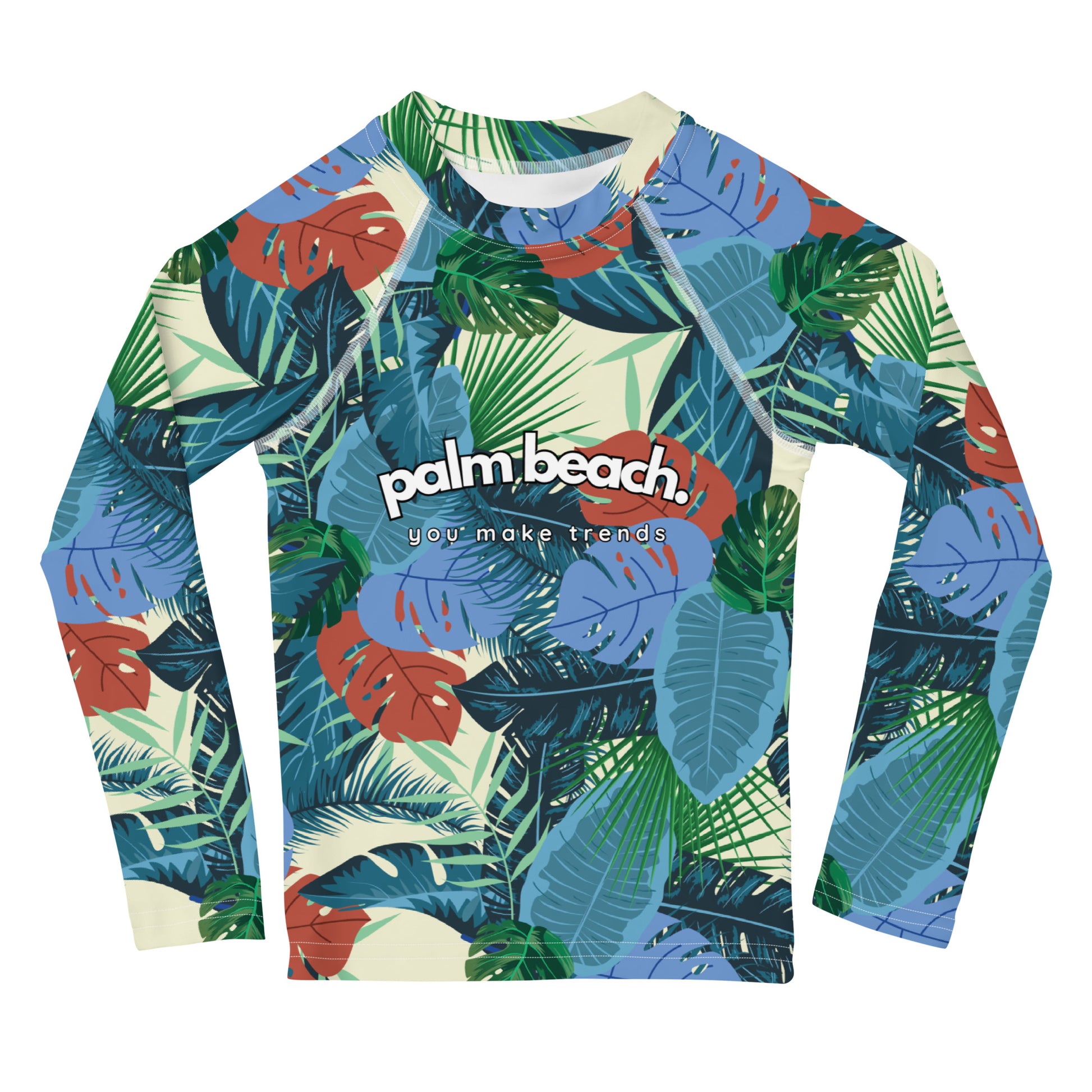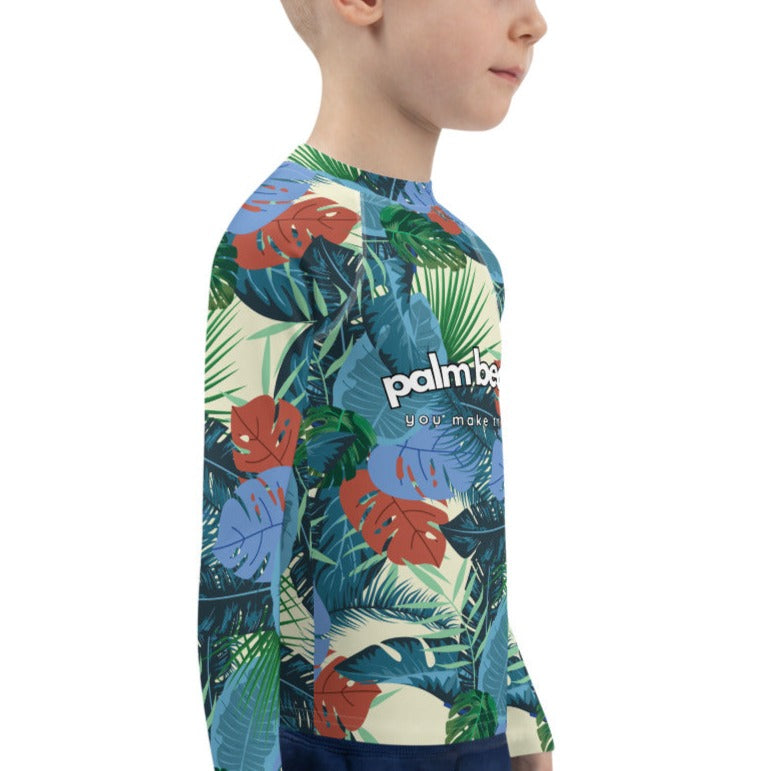 kids long sleeve rash guard swim top UPF50 palm beach by night blue tropical.